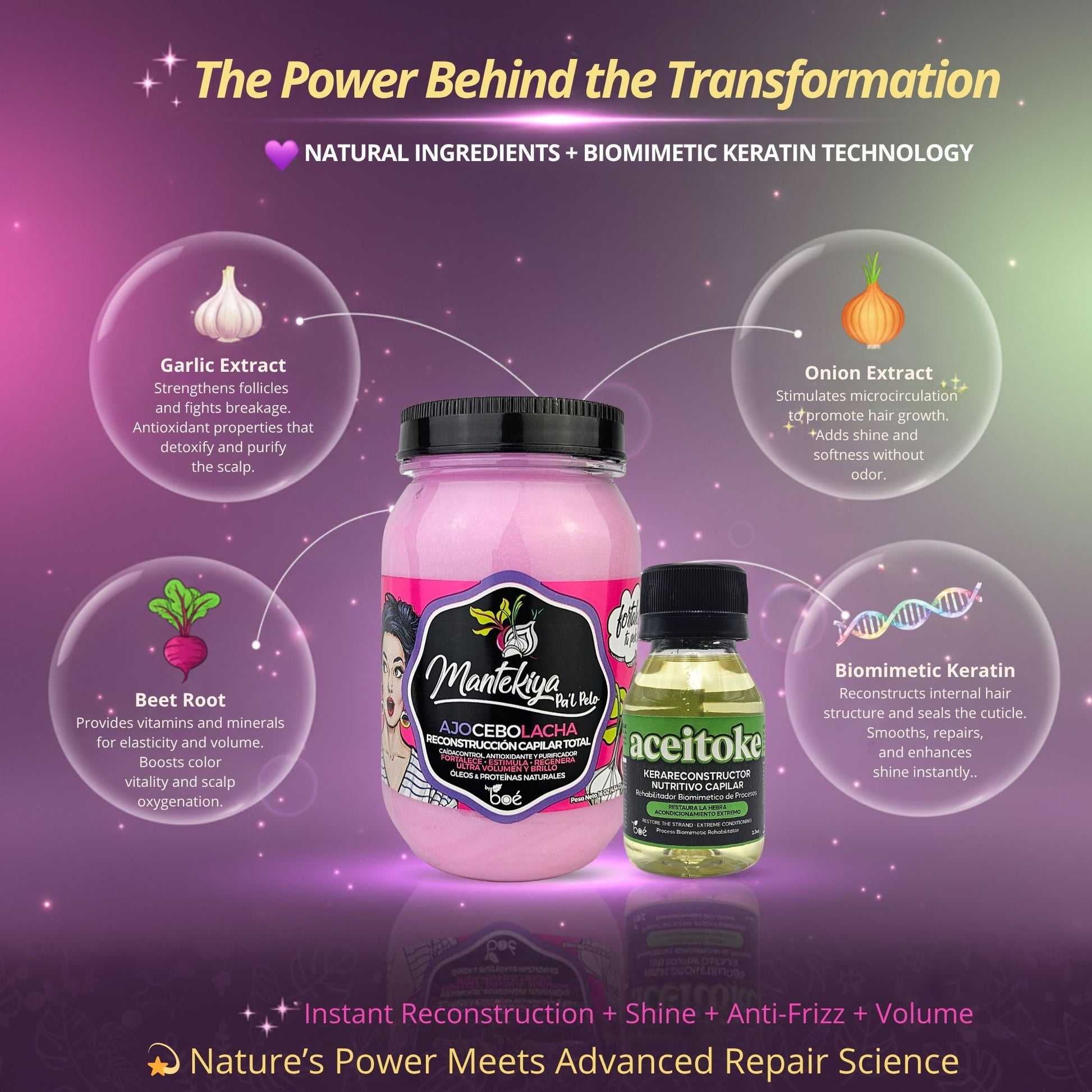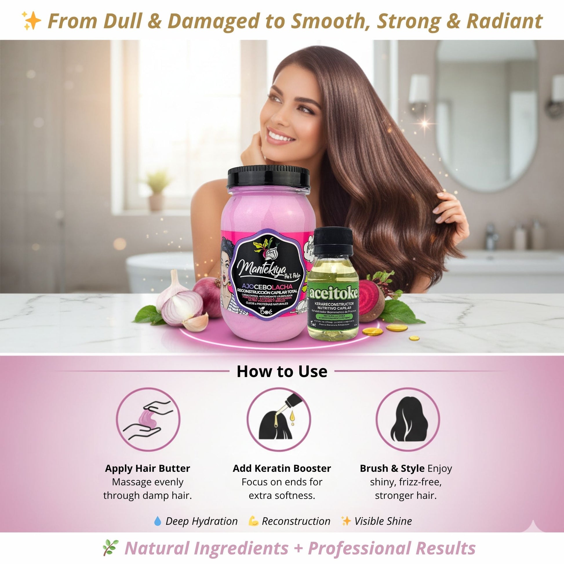 Hair Repair & Anti-Hair Loss Bundle - Mantekiya Pal Pelo Garlic-Onion-Beet Hair Butter 16 oz + Aceitoke KeraReconstructor 2.3 oz